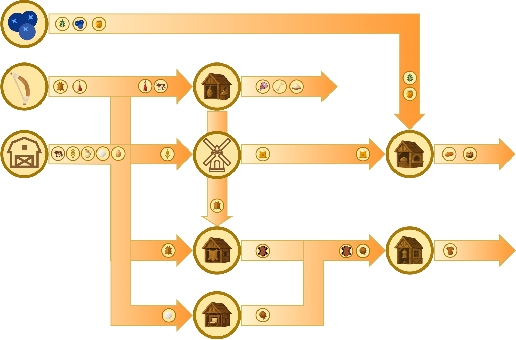 - Bakery – turns flour and firewood into bread and other baked goods.