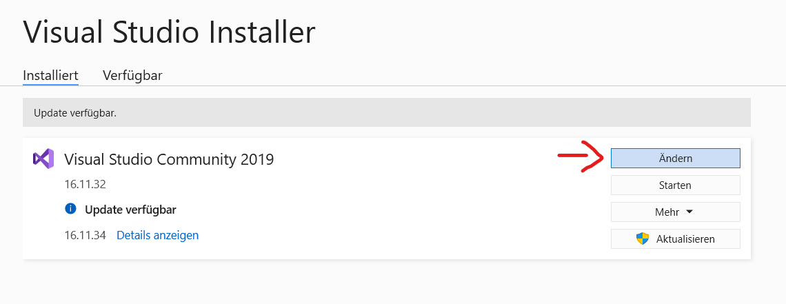 Download Visual Studio Community (https://visualstudio.microsoft.com/de/vs/community/). Run the execution File. After installation open the Visual Studio Installer and click on the button "change"