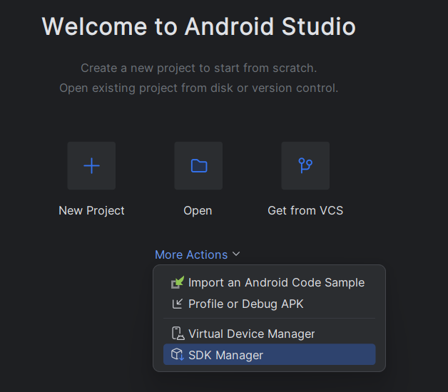Then download Android Studio (https://developer.android.com/studio). When starting Android Studio click on More Actions > SDK Manager.