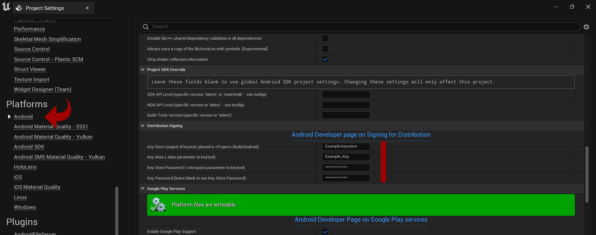 - copy the Example.keystore file to Project/Build/Android