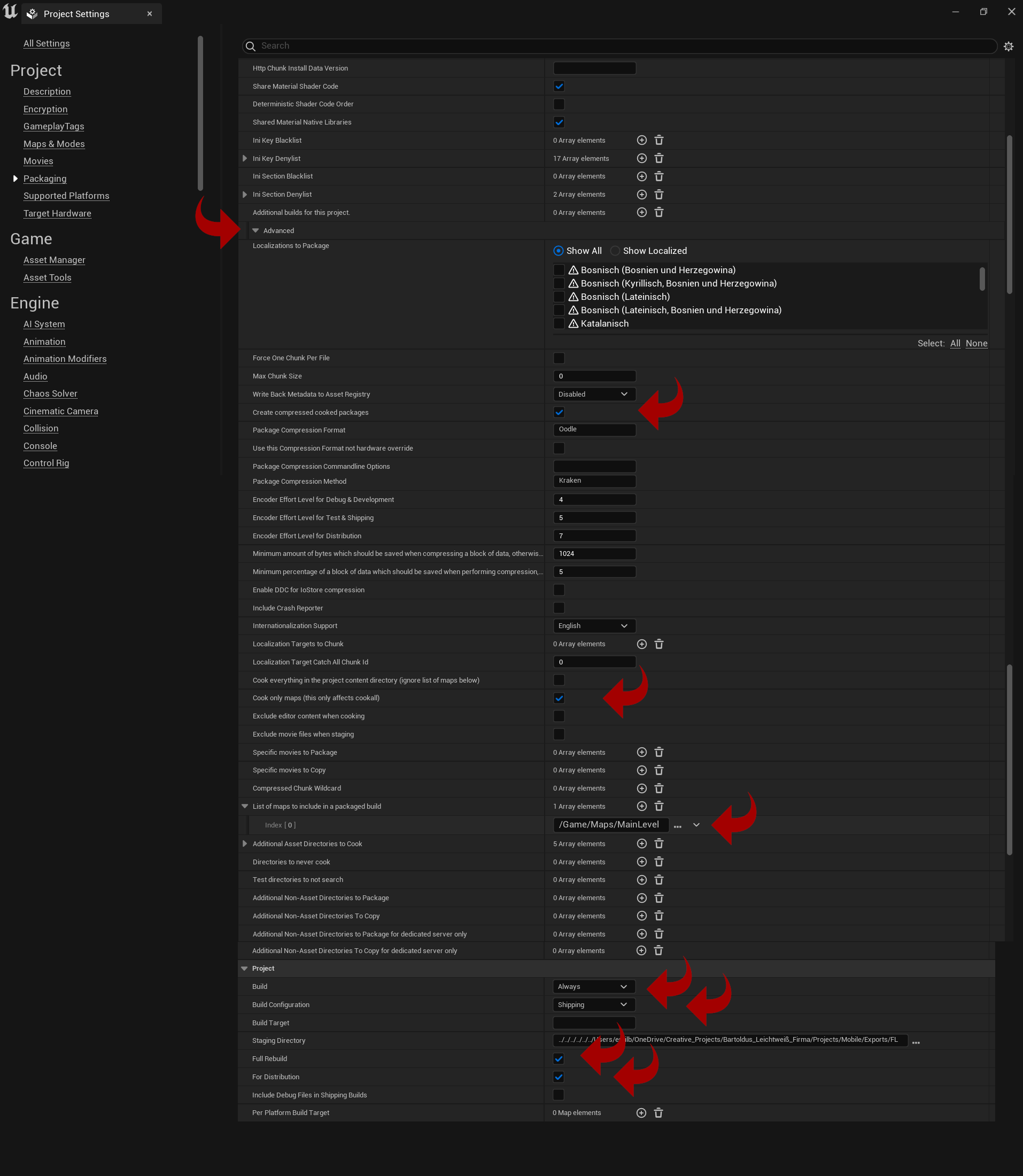 After changing all your Project Settings you can export your application. If you see a grey warning triangle, click refresh "platform Status". Define your config as indicated by the red arrows below.