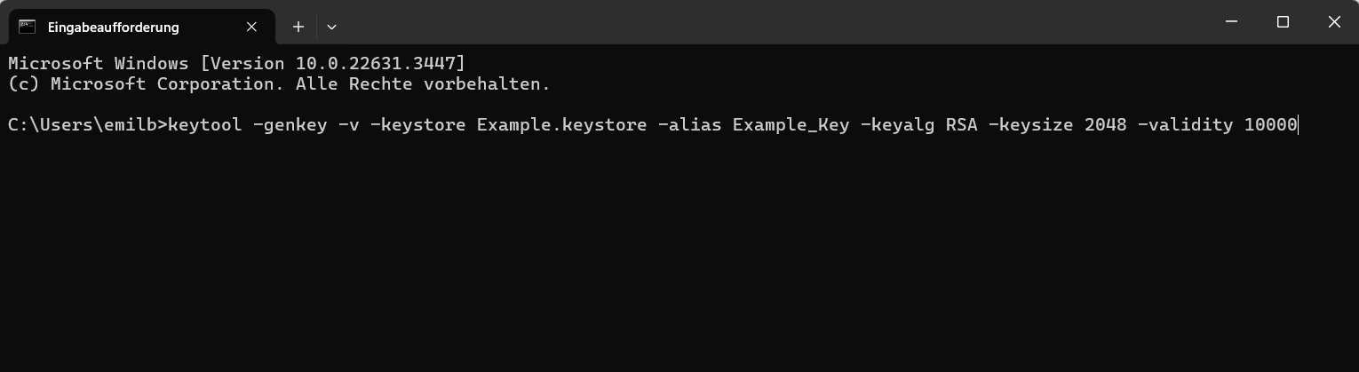 keytool -genkey -v -keystore Example.keystore -alias Example_Key -keyalg RSA -keysize 2048 -validity 10000