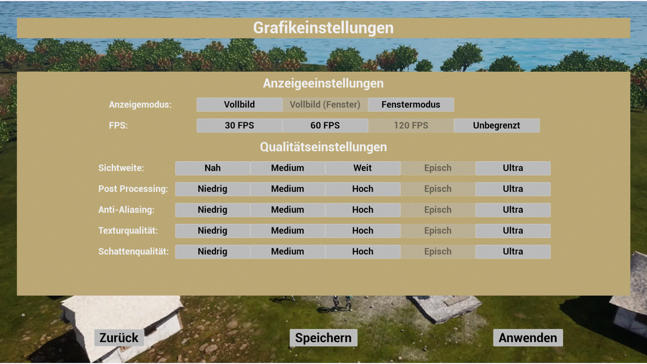 To support a wide range of different players and PCs, the game can be configured in the Settings screen. This screen allows players to customize their gaming experience by adjusting the game's settings to their needs. As with most games, settings are categorized into tabs, including general, gameplay, video and audio settings, as well as options for customizing the controls (although most of these settings are yet to be implemented).