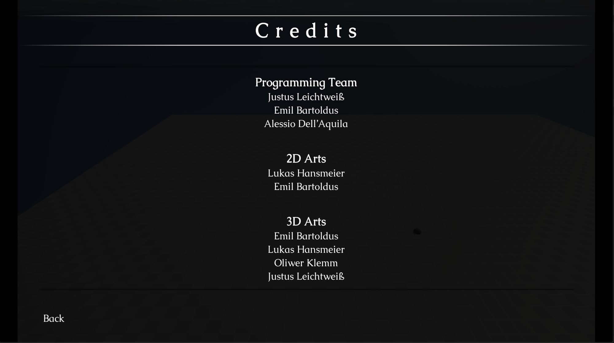 Lastly, the Credits screen simply shows who has worked on what part of the game.