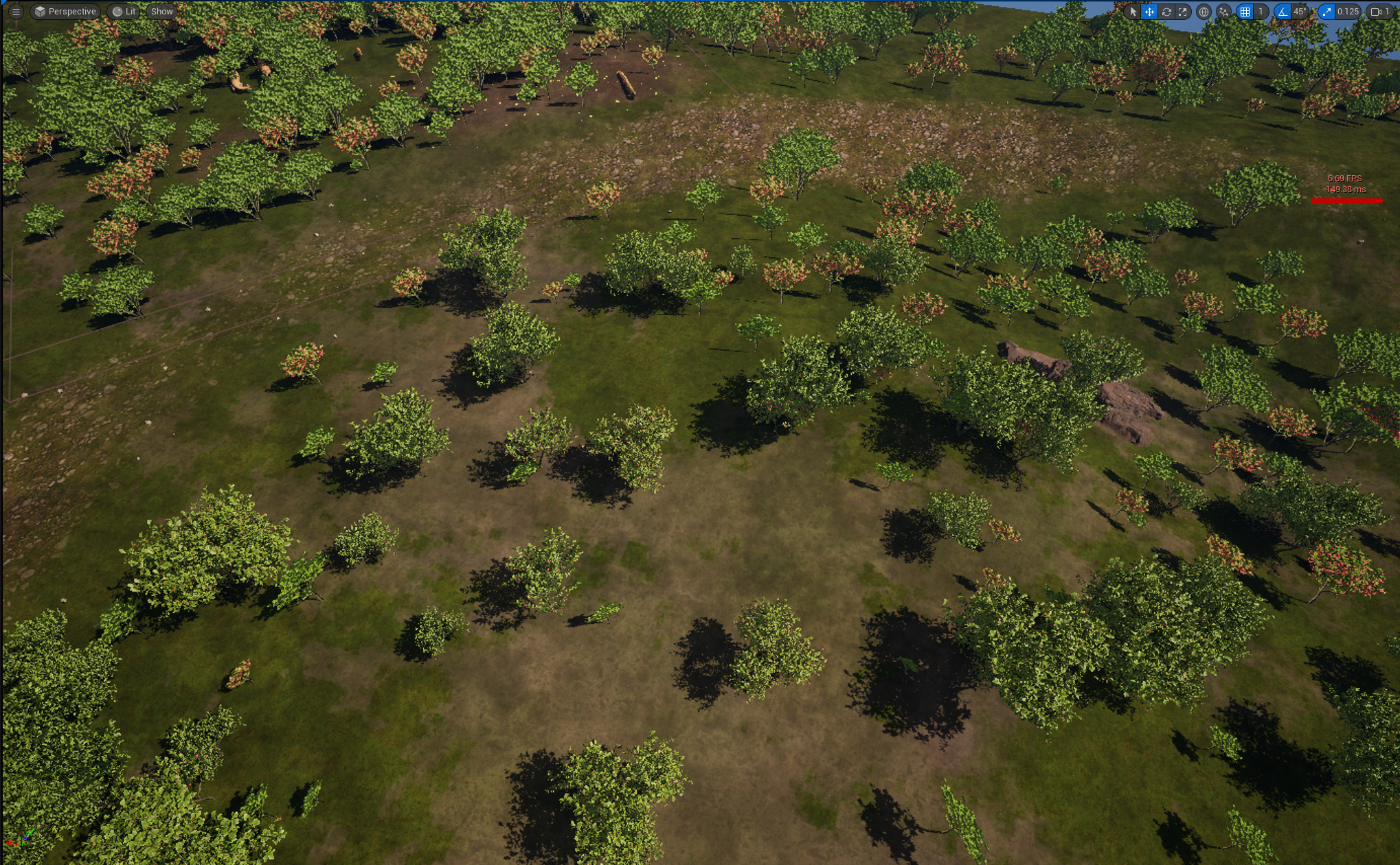 During the development of our new project "Colossus," we encountered a significant performance issue. As our map expanded and more assets and foliage were added, our Frames per second (FPS) started to drop drastically. The FPS fluctuated between 10 and 50 every tick, hindering our progress. (You can view your FPS by pressing Ctrl+Shift+H).